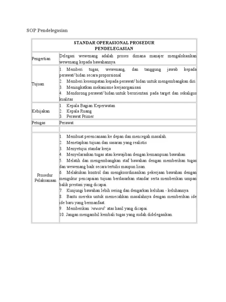 Evaluasi pelaksanaan wewenang yang di delegasikan. Di dalam uu keperawatan pasal 32 disebutkan pelimpahan wewenang secara delegatif untuk melakukan suatu tindakan medis diberikan oleh tenaga medis kepada perawat dengan disertai pelimpahan … 06.02.2019 · inilah pembahasan selengkapnya mengenai contoh surat pendelegasian wewenang dokter ke perawat. B)pelaksanaan tindakan yang dilimpahkan dokter tetap di bawah pengawasan dokter. 16.04.2018 · download as docx, pdf, txt or read online from scribd.